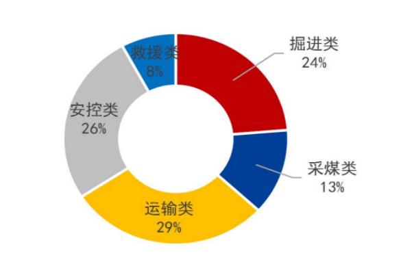 高端煤機制造裝備也為煤礦智能化帶來顯著加持。中國工程院院士、中國煤炭科工集團首席科學家王國法在2023中國煤炭工業發展暨技術裝備創新高峰論壇上表示,目前,全國首批70處智能化煤礦建設示范取得顯著成效,其中,井工礦65處,露天5處,煤礦總產能超6億噸,目前已有50余處示范建設的智能化煤礦通過驗收,達到中級智能化煤礦水平,預計今年底將全部完成驗收,為全國煤礦智能化建設提供可復制的經驗和樣板。從國內煤礦機器機器人的市場結構來看,2022年,國內運輸類煤礦機器人市占最大,達29%;其次是安全控制類,占比26%;掘進類和采煤類機器人分別占比24%、13%。