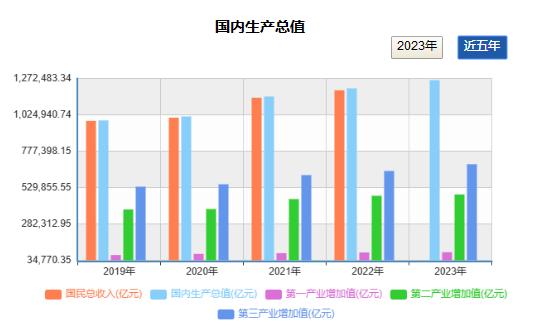 據介紹,初步核算,2023年全年國內生產總值1260582億元,按不變價格計算,比上年增長5.2%。分產業看,第一產業增加值89755億元,比上年增長4.1%;第二產業增加值482589億元,增長4.7%;第三產業增加值688238億元,增長5.8%。分季度看,一季度國內生產總值同比增長4.5%,二季度增長6.3%,三季度增長4.9%,四季度增長5.2%。從環比看,四季度國內生產總值增長1.0%。