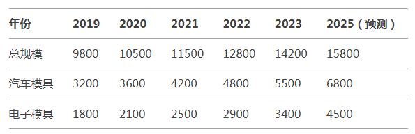 圖1:2019-2025年中國模具行業市場規模及結構(億元)
