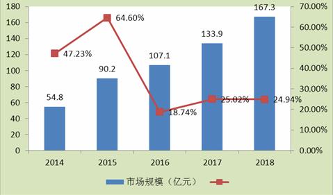據(jù)不完全統(tǒng)計,2018年中國醫(yī)療美容器械行業(yè)市場規(guī)模為167.3億元,交2017年同比增長24.94%,2014-2018年復合增長率達32.18%