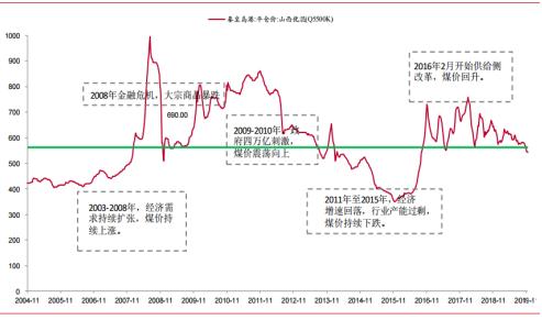 復盤煤價歷史,目前動力煤價格處于中樞水平。2003年至今,秦皇島港山西優混(Q5500K)均價是562元/噸,預計未來2-3年行業供需皆是低增長,韌性猶存,估計煤價在均值附近震蕩時間較長,