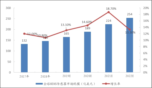 在物聯網時代,符合需求的傳感器必須具備低功耗、微型化、智能化、多功能復合等特性。2018年,全球MEMS傳感器市場規模約為146億美元,同比增長10.8%,消費電子、汽車電子和工業控制是應用MEMS最多的三個下游板塊,其中智能終端的需求是近年最大的增長點。2018-2022年MEMS傳感器全球市場規模年化增速預計將達14.85%。