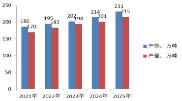 圖表:2021-2025年中國活性氧化鎂產能及產量預測