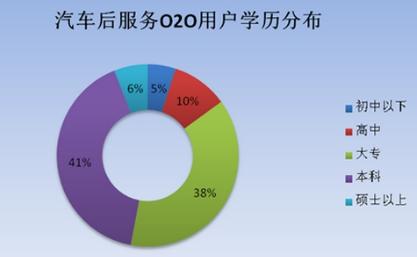 調查結果顯示,在汽車后服務O2O行業的用戶學歷以本科和大專為主,分別占比41%和38%,幾乎達到了總體的80%,高中學歷用戶占比10%,碩士以上和初中以下分別占比6%和5%。說明我國汽車后服務O2O用戶基本以相對較高學歷為主,對O2O模式的接受能力也較快,而隨著汽車后服務O2O模式的快速發展,這種便捷經濟的方式將會在各個階層得到普及。
