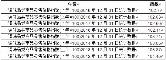 2012-2019年我國調味品類價格指數整體呈現下降趨勢。居民消費價格指數從2012年的104.2下降至2019年102.6,下降了1.6。而商品零售價格指數方面,2019年調味品類零售價格指數為102.7,比2012年104.5下降了1.8。