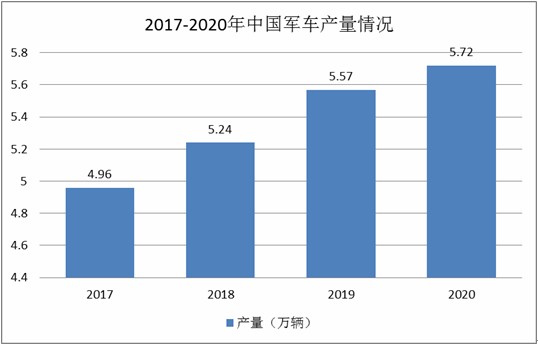 據(jù)不完全統(tǒng)計,2020年國內(nèi)軍車產(chǎn)量約為5.72萬輛,較2019年上漲了2.69%。隨著國內(nèi)國防軍事投入的增加,國內(nèi)軍車的需求量逐漸提高,相應(yīng)的,產(chǎn)量也有較大幅度的上升。