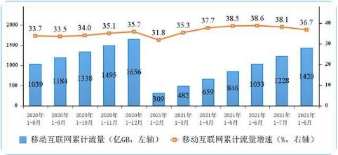 2020-2021年1-8月份移動(dòng)互聯(lián)網(wǎng)累計(jì)接入流量及增速情況