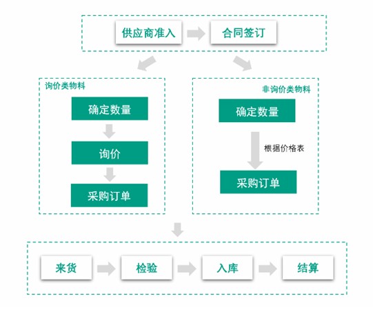 生產部門制定生產計劃,計劃部門通過ERP系統(tǒng)進行MRP(物料需求計劃)運算得出相應物料的采購需求。對于鋼材、塑料、銅質漆包線等詢價類物料,采購需求經審批通過后,根據采購需求量進行詢價,確定供應商及采購價格后下達采購訂單;對于電子元器件、電機、五金塑料制品、包裝材料等非詢價類物料,按采購需求數量及先前已確認的采購價格直接生成采購訂單。供應商將貨物送達公司后,根據質檢方案對物料進行檢驗,檢驗合格后予以入庫。