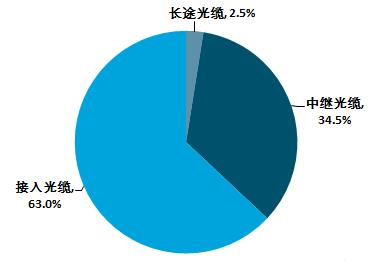 運營商光纖光纜部署分為長途光纜、中繼光纜和接入光纜三類。截至2019年6月底,我國長途光纜線路、本地網中繼光纜和接入網光纜、所占比重分別為2.5%、34.5%和63%。