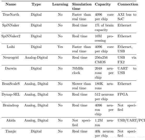 類腦運算平臺或者類腦芯片, 是受到生物學腦工作機制啟發開發的專用于為SNN提供計算的硬件系統。制作類腦芯片最具有挑戰性的是如何把不計其數spiking 神經元和突觸放進一個小小的芯片里并同時讓他們的鏈接結構是可調整的。