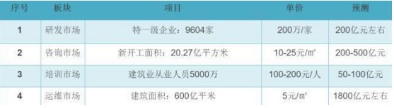 根據(jù)BIM產(chǎn)業(yè)的特點(diǎn), BIM產(chǎn)業(yè)主要可分為四個(gè)細(xì)分市場-——軟件、咨詢、培訓(xùn)與運(yùn)維市場。具體市場空間測算如下: