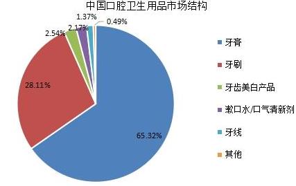 隨著人們生活水平的提高以及口腔護理意識的提升,消費者對于口腔護理的訴求愈發多樣化,消費者對于與此相關的產品,包括牙膏、牙刷、牙齒美白產品、漱口水、牙線等產品的需求也日益提高,帶動相關口腔護理細分產品的銷售。據數據顯示,牙膏占比為65.32%,牙刷占比為28.11%。