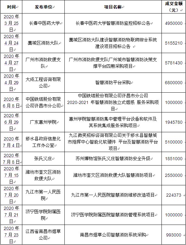 圖表:2020年我國部分智慧消防項目招標情況