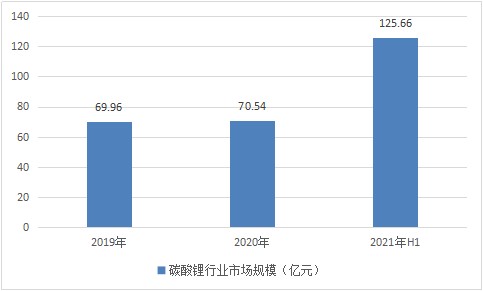 圖表:2019-2021年H1碳酸鋰行業市場規模(億元)