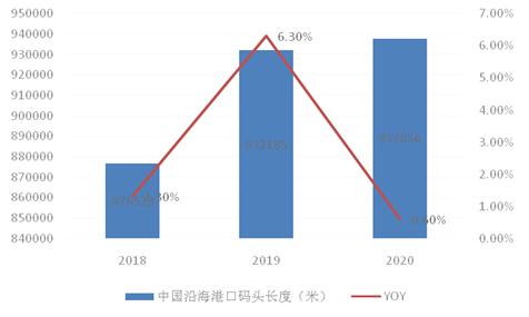 在開發(fā)與建設(shè)上,我國(guó)沿海生產(chǎn)用深水碼頭開發(fā)與建設(shè)加快,沿海港口碼頭長(zhǎng)度逐年增加,2020年我國(guó)沿海港口碼頭長(zhǎng)度為937856米,同比增長(zhǎng)0.6%。