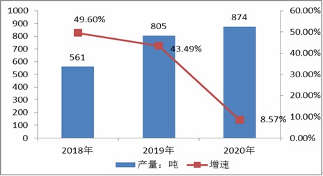 由于疫情的影響,2020年高純氮化硅行業產量增速下滑較大,由2019年的43.49%的增速下降為8.57%的增速。2020年高純氮化硅市場產量為874噸。