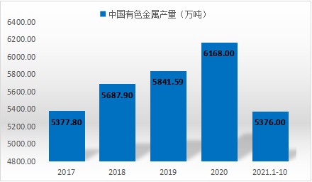 我國十種有色金屬產量一直呈增長趨勢,增速有所放緩。2019年我國十種有色金屬為5841.59萬噸,同比增長2.70%。規上有色金屬工業增加值增長8.2%,高于工業平均2.5個百分點。2021年1-10月產量為5376.0萬噸。