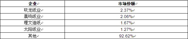 目前我國造紙行業企業數量多且規模小,市場集中度不高,主要公司包括:玖龍紙業、理文造紙、晨鳴紙業、太陽紙業等,其中CR4為7.38%,重復建設的現象較嚴重,行業核心競爭力不強,未來隨著造紙行業的發展以及環保等政策的支持,造紙行業的市場集中度將會進一步提高。