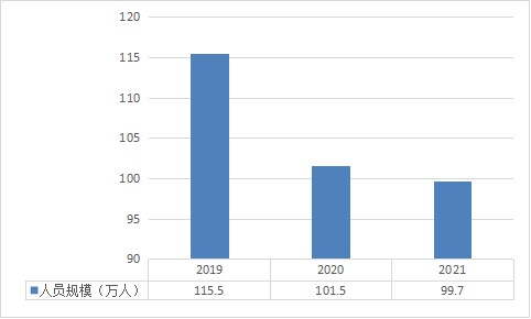 2019-2021年隨著我國(guó)涂料行業(yè)整體市場(chǎng)集中度的提升,限額以下企業(yè)不斷被清退,行業(yè)企業(yè)人員規(guī)模呈現(xiàn)出連續(xù)下降態(tài)勢(shì),2021年行業(yè)人員規(guī)模降至為99.78萬(wàn)人。