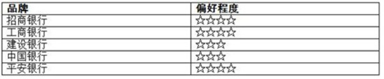 目前,我國(guó)消費(fèi)者比較傾向于招商銀行、工商銀行、建設(shè)銀行、中國(guó)銀行、平安銀行等品牌,其中招商銀行、工商銀行和平安銀行的偏好程度比較高。