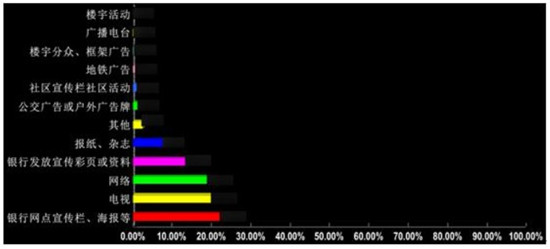 關(guān)于消費(fèi)者對(duì)房產(chǎn)證抵押貸款產(chǎn)品宣傳廣告的獲取渠道調(diào)查,接近1/4的受訪者表示銀行網(wǎng)點(diǎn)宣傳欄、海報(bào)等是最主要的形式,其次是電視和網(wǎng)絡(luò),分別有20%左右的比例。