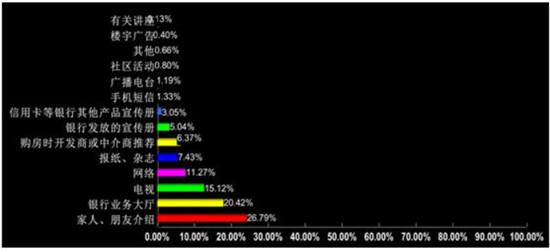 關(guān)于房產(chǎn)證抵押貸款品牌信息的獲得渠道,超過1/4的受訪者表示是家人和朋友介紹,銀行業(yè)務(wù)大廳以超過20%的比例位居其二。