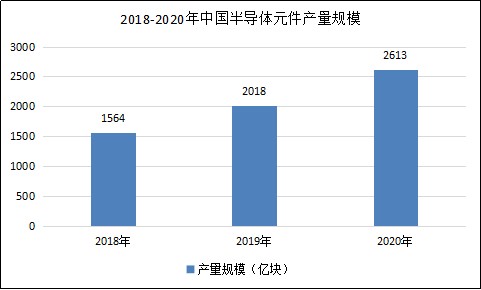據數據顯示,2019年中國半導體元件產量規模為2018億塊,2020年中國半導體元件產量規模為2613億塊,同比增速為29.48%。