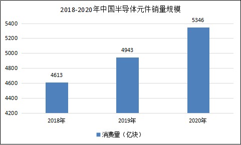 據數據顯示,2019年中國半導體元件銷量規模為4943億塊,2020年中國半導體元件銷量規模為5346億塊,同比增速為8.14%。