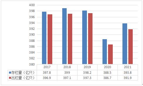 圖表:2017-2021年全球肉雞養殖存欄量與出欄量情況