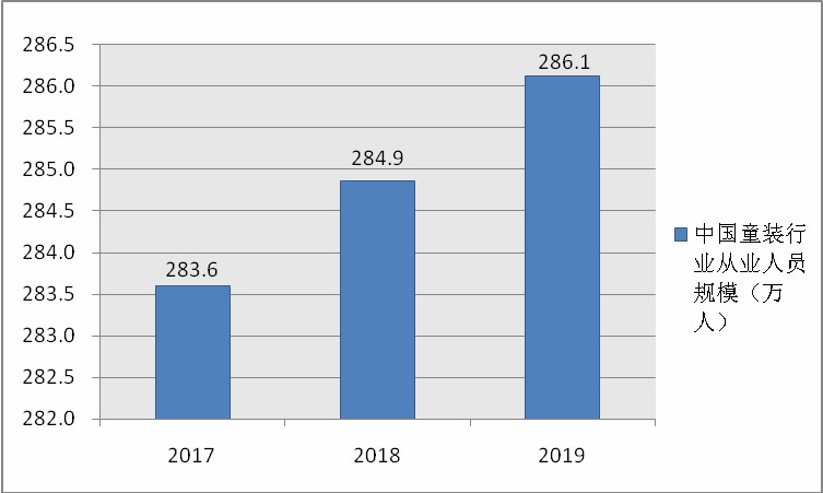 2017-2019年中國童裝行業從業人員規模呈逐年增長趨勢,2017年從業人員數量為283.6萬人,到2019年底中國童裝行業從業人員數量規模已經達到約286.1萬人的水平。