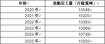 圖表:2020-2025年船舶制造行業造船完工量預測(單位:萬載重噸)