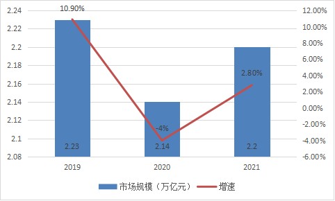 2021年中國(guó)科技服務(wù)業(yè)市場(chǎng)規(guī)模達(dá)到了2.2萬億元,GDP占比在2.2%左右,市場(chǎng)規(guī)模較2020年期間同比增長(zhǎng)大約2.2%。