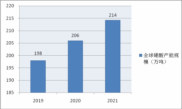 圖表:2019-2021年全球硼酸產能規模(單位:萬噸)