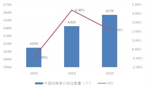 沿海港口基礎設施的不斷擴大和改善,也支撐了國民經濟和對外貿易的快速發展。港口泊位數作為港航設施,可以反映出港口所能容納裝卸船只的數量規模,泊位數越多,裝卸的船只及其貨物自然增加,也是反映港口物流服務能力的基本條件,與港口經濟水平有較強聯系。2020年我國沿海港口擁有碼頭泊位6570個,同比增長2.2%。
