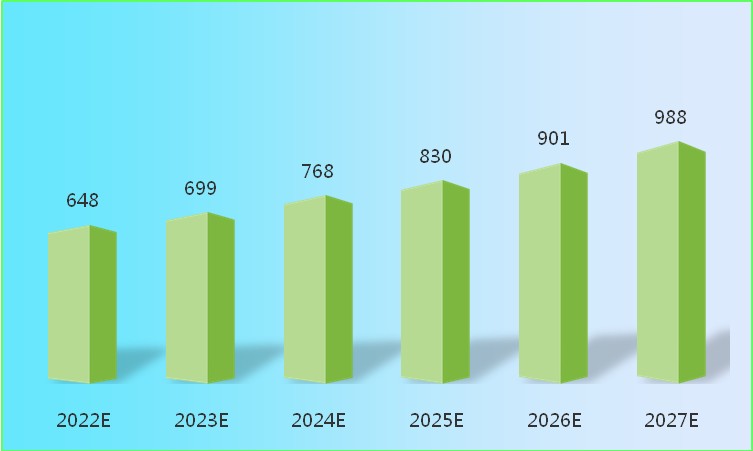 圖表:2022-2027年美白化妝品產品市場規模預測(億元)