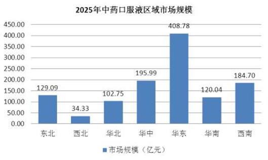 據數據顯示,預計2025年中藥口服液區域的市場規模最高的是華東地區有,有408.78億元,其次是華中195.99億元。
