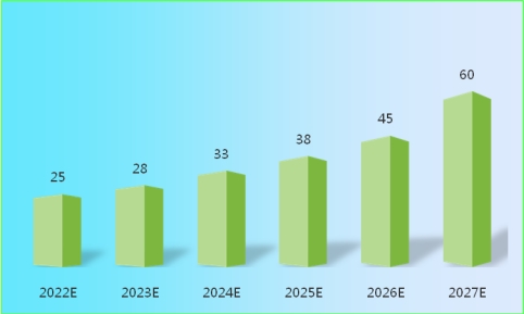 圖表:2022-2027年軍用氫燃料電池市場規(guī)模預(yù)測(億元)