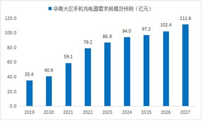 2019-2021年華南地區手機充電器行業需求規模保持增長趨勢,2021年市場規模為59.1億元,預計2022-2027年在消費水平增長推動下,2027年需求規模將達111.6億元。