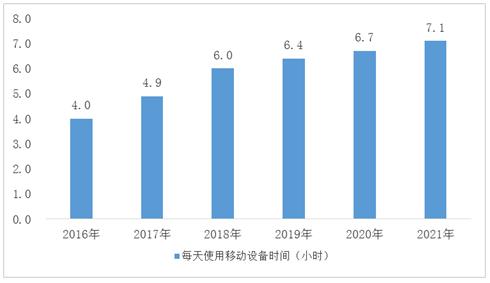 圖表:2016-2021年中國用戶每天使用移動設備時間