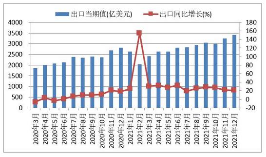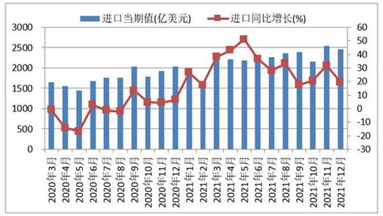 根據海關統計數據,2021年1-12月份,我國外貿進出口總額為60514.9億美元,同比增長30%。貿易差額為6764.3億美元。其中進口為26875.3億美元,同比增長30.1%。按人民幣計算,2021年1-12月份,進口173660.9億元,同比增長21.5%。