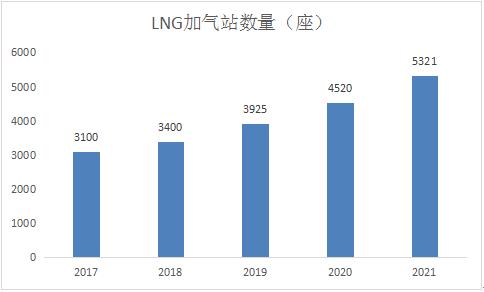 圖表:2017-2021年國內(nèi)LNG加氣站數(shù)量走勢(單位:座)