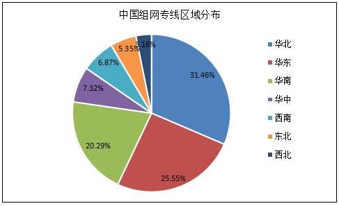 中國組網專線區域華北地區占比31.46%,華東地區占比25.55%,華南地區占比20.29%。