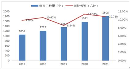 圖表:2017-2021年通信設備行業新開工項目數量及增長率
