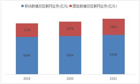 2021年,固定數據及互聯網業務實現收入2601億元,比上年增長9.3%,在電信業務收入中占比由上年的17.4%提升至17.8%;移動數據及互聯網業務實現收入6409億元,比上年增長3.3%。