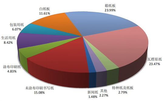 在紙及紙板的消費量中,需求最大的是箱紙板,占比23.99%,其次是瓦楞原紙,占比23.47%。