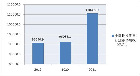 圖表:2019-2021年中國批發零售行業市場規模(單位:億元)