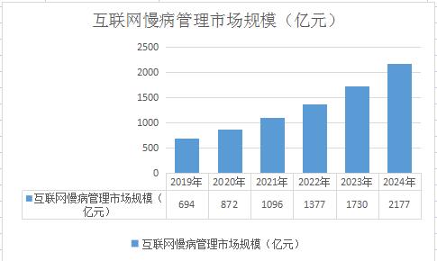 2019年,中國(guó)互聯(lián)網(wǎng)慢病管理行業(yè)市場(chǎng)規(guī)模達(dá)694億元人民幣,潛在規(guī)模達(dá)3000億元。預(yù)計(jì)2024年,市場(chǎng)規(guī)模將達(dá)2177億元,預(yù)測(cè)期年復(fù)合增速達(dá)25.7%。