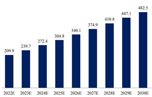 圖表:2022-2030年全球抗腫瘤藥物市場規(guī)模預(yù)測(十億美元)