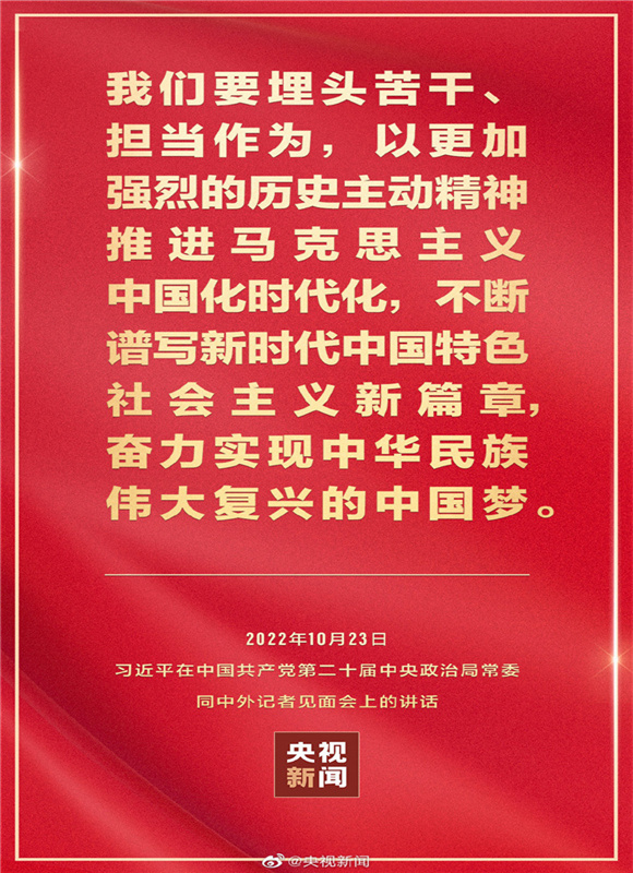 在新一屆中央政治局常委同中外記者見面#時(shí),習(xí)近平總書記提出了四點(diǎn)要求,新征程上,我們要始終保持昂揚(yáng)奮進(jìn)的精神狀態(tài),要始終堅(jiān)持一切為了人民、一切依靠人民,要始終推進(jìn)黨的自我革命,要始終弘揚(yáng)全人類共同價(jià)值。這是黨的號(hào)召,也是時(shí)代的要求;這是前進(jìn)的號(hào)角,也是行動(dòng)的方向。新征程是充滿光榮和夢(mèng)想的遠(yuǎn)征。每個(gè)人都可以、也都應(yīng)該通過自己的努力拼搏,交上一份不負(fù)自己、不負(fù)時(shí)代的答卷。