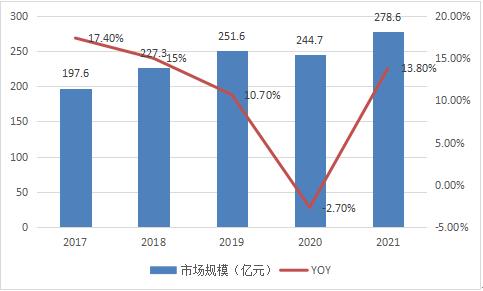 根據wind相關數據顯示,2017-2021年中國便攜式色差儀行業市場規模情況如上圖所示。行業市場規模由2017年的197.6億元增長至為2021年的278.6億元,5年間年復合增長率達10.6%,可以看出,近些年來,隨著我國經濟平穩持續運行,產品下游市場發展迅速,直接帶動了我國便攜式色差儀產品呈現出量價齊升的局面,使得該行業市場規模得到了較為快速的發展。